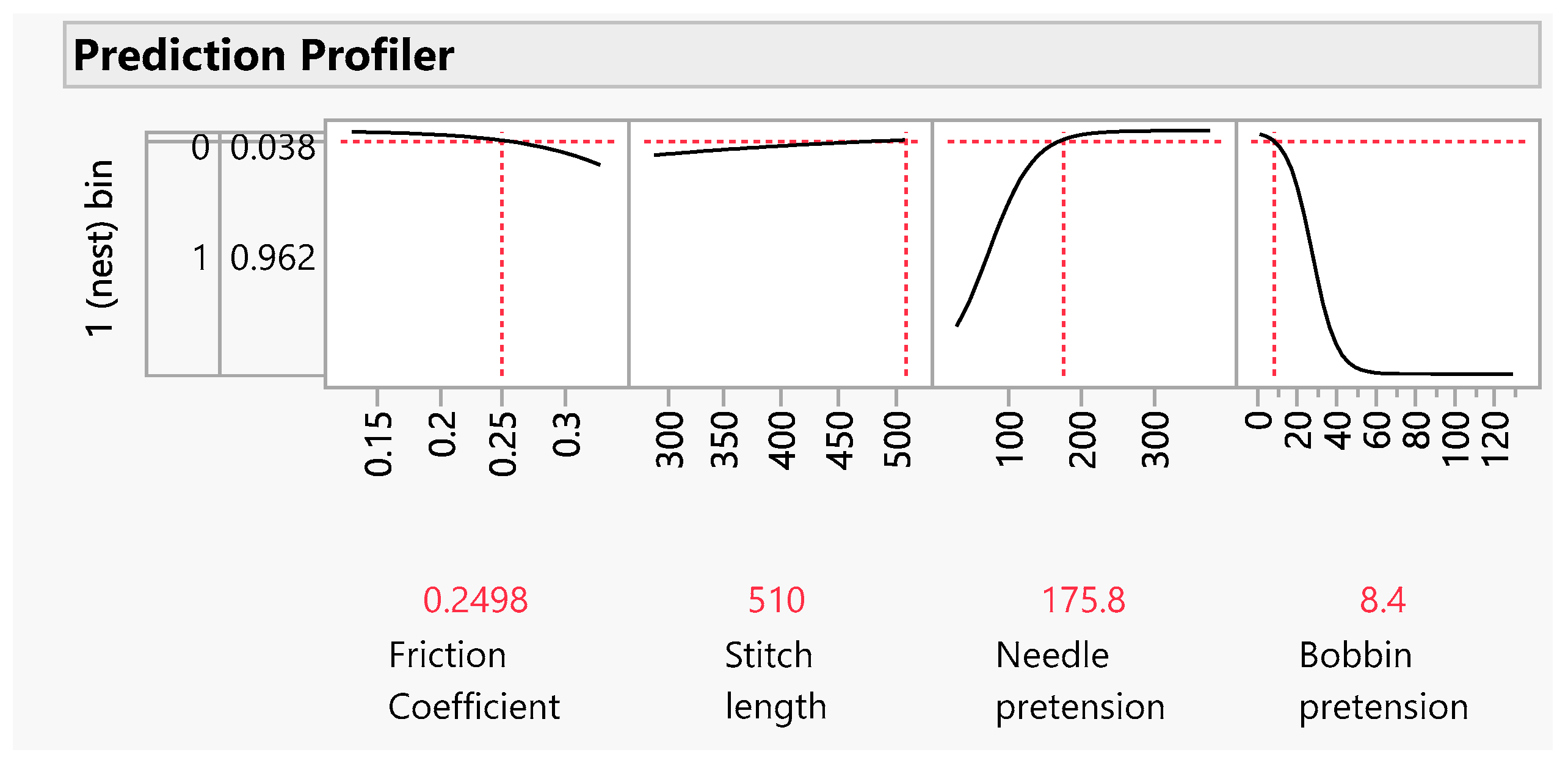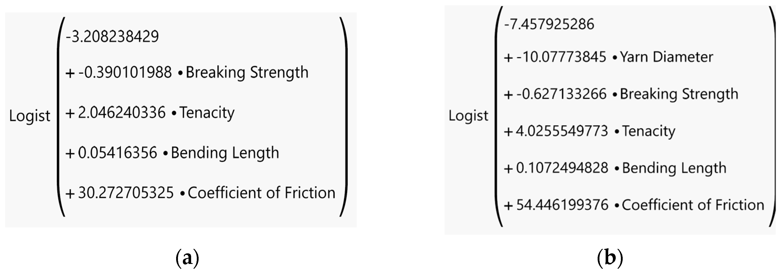 3.2. Predictive Analysis to Determine if a Yarn Is Sewable Under Specific Sewing Conditions