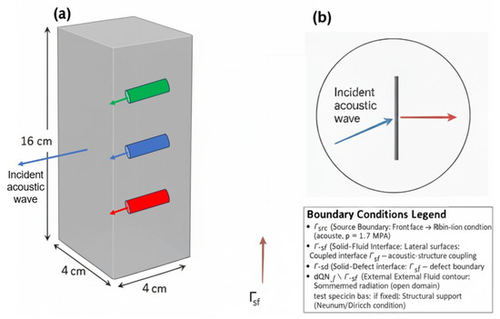 From a modeling perspective, we have considered our scenario to be composed of the following domains in : the solid concrete domain , within which lies the defect , filled with air and modeled as an acoustic fluid, and an external fluid domain , which represents the surrounding air. The interfaces are defined as (internal solid–cavity interface) and (external solid–fluid interface). The outward unit normal vector with respect to the fluid is denoted by on the acoustic–structure interfaces. The specimen dimensions are . The defect is represented as a cylinder of radius and height (see the setup description in Section 2.3), whose position varies along each of the three spatial directions as continuous parameters. Figure 1 shows the aforementioned geometric configuration. The time variable is with [].