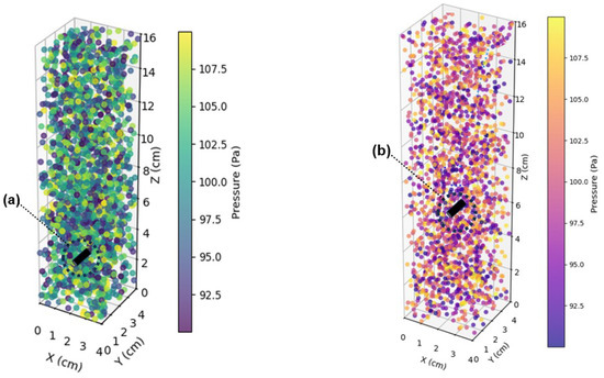 Total acoustic pressure distribution in space, computed using the coupled acoustic–structural formulation in evolutionary regime for a concrete specimen with an internal cavity. (Left): Total acoustic pressure distribution in the presence of the defect located at (a). (Right): Total acoustic pressure distribution in the presence of the defect located at (b).