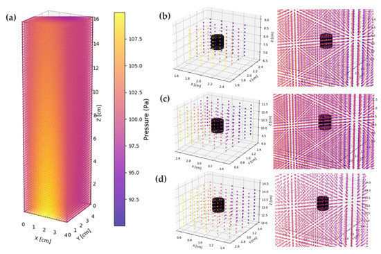 (a) Concrete specimen with ultrasonic acoustic pressure applied on the surface near the color bar. (b–d) Details of the modeled defect in different positions: (b) and and cm; (c) and and cm; (d) and and cm. For each defect, the enlarged pressure distribution (less dense) is shown on the left, while the localized detail of the specimen is displayed on the right.