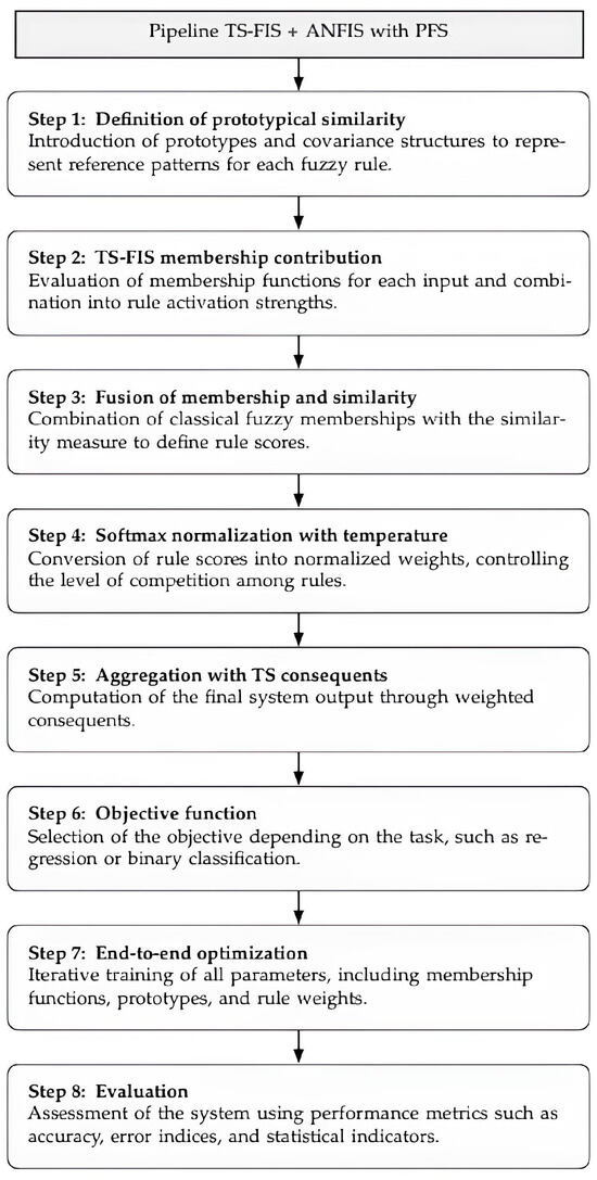In this section, we present our classification framework, integrating TS-FIS+ANFIS with the prototypical fuzzy similarity (PFS). Figure 5 shows the overall flowchart of the proposed approach. The diagram outlines the sequential stages of this hybrid framework: data preprocessing and feature normalization; rule generation and membership–similarity fusion; and adaptive learning of consequents and final classification. The integration of the TS-FIS+ANFIS with PFS allows the model to jointly exploit the interpretability of fuzzy inference and the adaptability of data-driven similarity learning. Each block in the flowchart highlights a key computational stage contributing to the enhanced robustness, interpretability, and numerical stability of the overall inference process.
