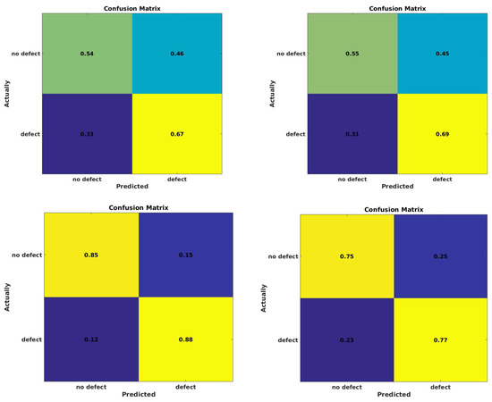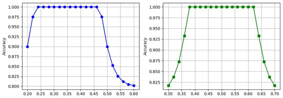 The data provided by the FEM numerical model described in Section 2 are subjected to feature extraction. Each sample is described by four input variables: the spatial coordinates and the ultrasonic sound pressure level , obtained from the spatio-temporal distribution of the acoustic pressure . The system output is 1 in the presence of a defect and 0 otherwise. The stationary computational analysis evaluates the equilibrium state reached by the system after an initial impulse, performing a parametric sweep of the defect position and focusing on the final distributions of stresses and strains in the material. The choice of as the acoustic input variable, instead of , is motivated by physical, numerical, and methodological reasons: it allows for direct comparison with standard values, compresses signal dynamics through the logarithmic scale improving numerical stability, provides an immediate physical interpretation related to acoustic power, and ensures the consistency between stationary and transient studies. Given , over a time window of duration T centered at , we compute the and thus the sound pressure level [69]. Then, for each sample we define the input vector , , and the inputs are normalized, , via z-score [69].