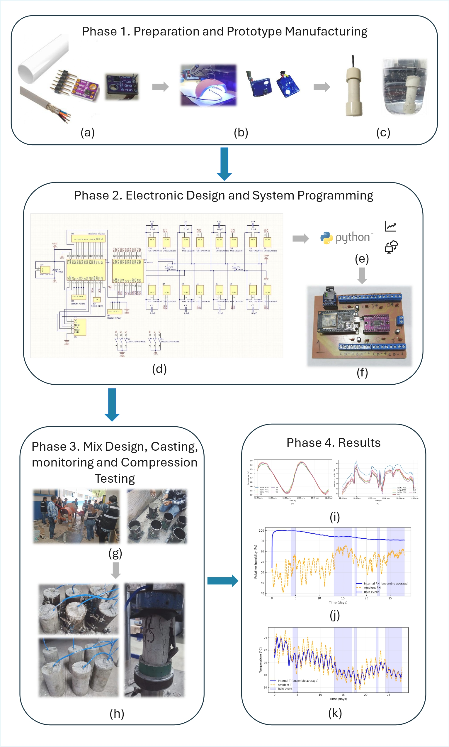 Figure 2 illustrates the complete process, from prototype fabrication and electronic integration to concrete specimen preparation, mechanical testing, and data analysis.