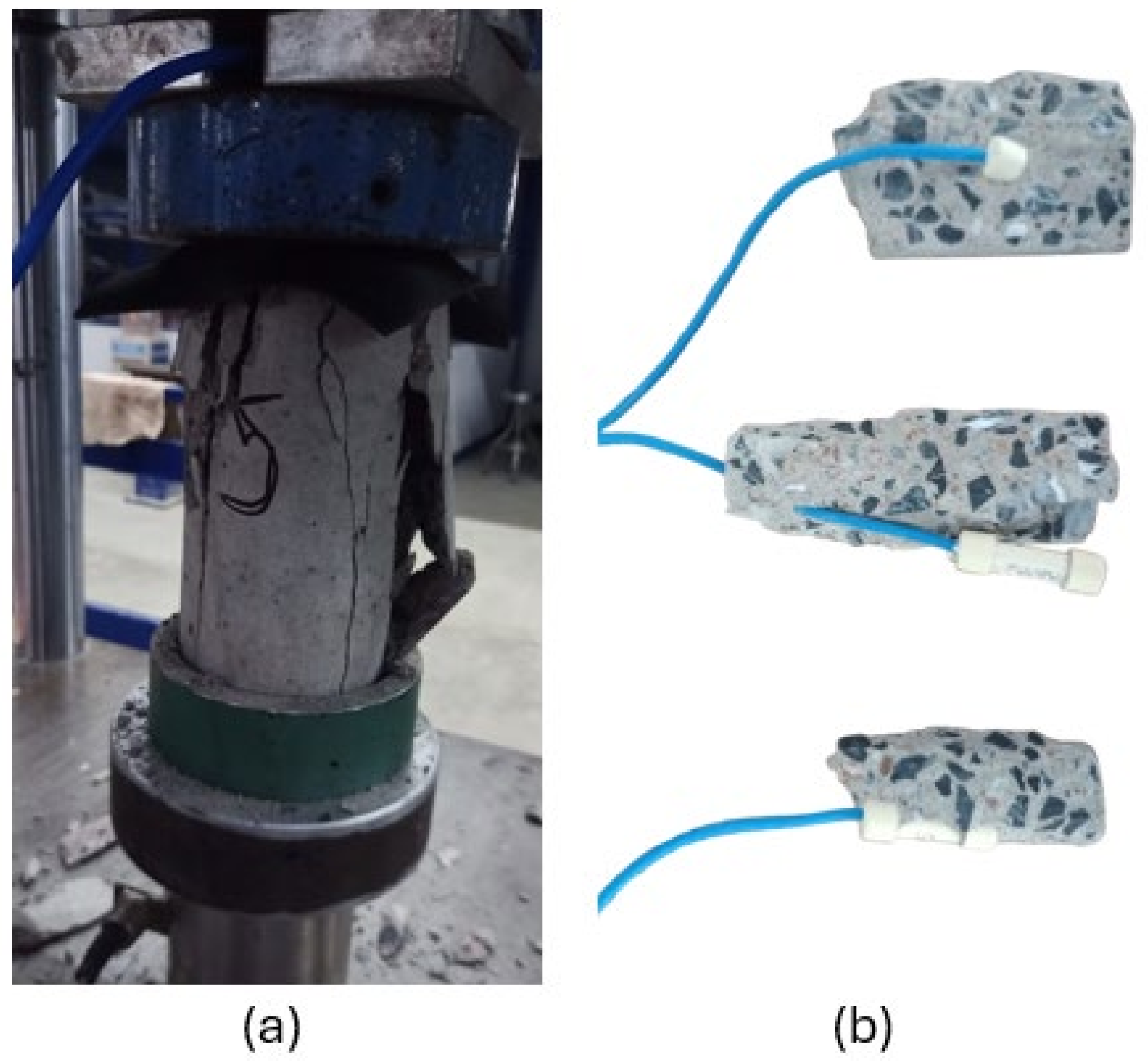 24]. The primary objective of these tests was to evaluate the potential mechanical impact of the embedded monitoring system on the concrete cylinders.