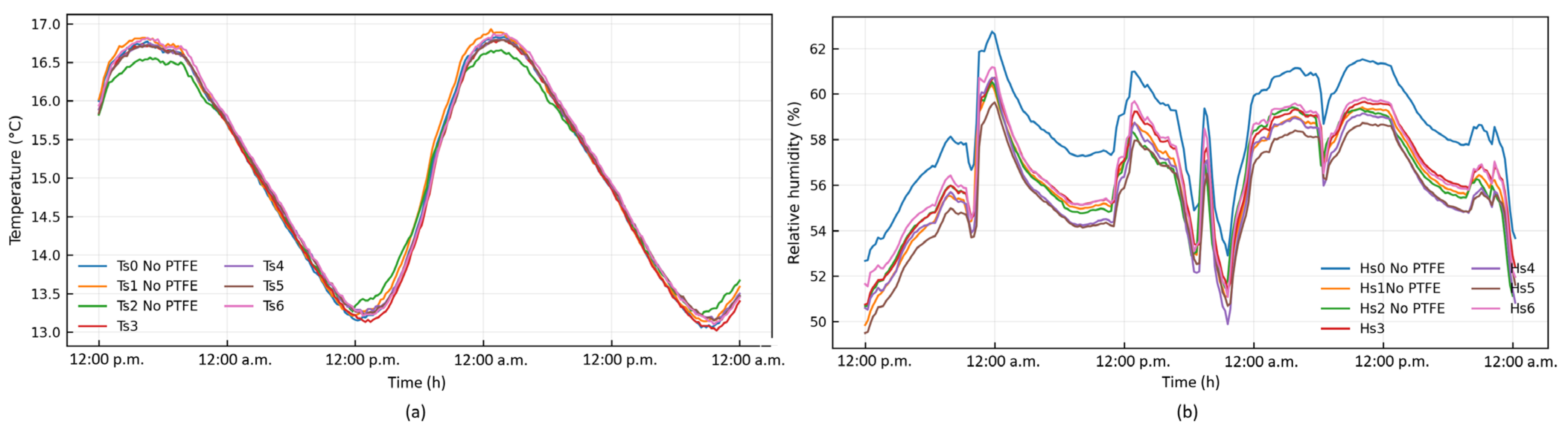 Figure 8 presents the time series of the recorded measurements, where panel (a) corresponds to temperature and panel (b) to relative humidity. All sensors were exposed simultaneously to the same environmental conditions, allowing direct comparison of their responses.