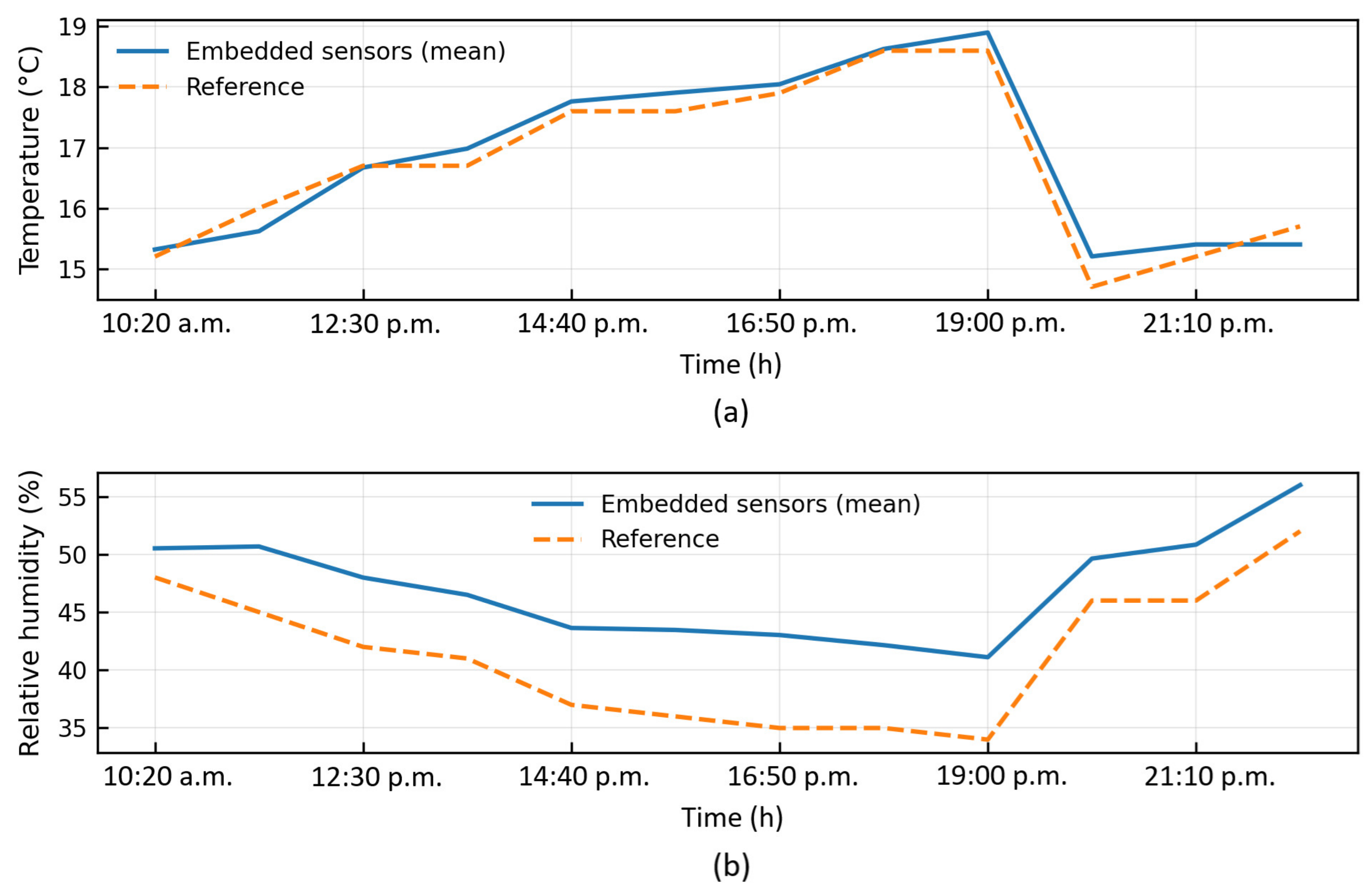 To characterize the consistency of the sensor array prior to embedding, the ensemble behavior was evaluated under controlled laboratory conditions. The mean instantaneous standard deviation (SDinst) was 0.0695 °C for temperature and 0.9732% RH for relative humidity.