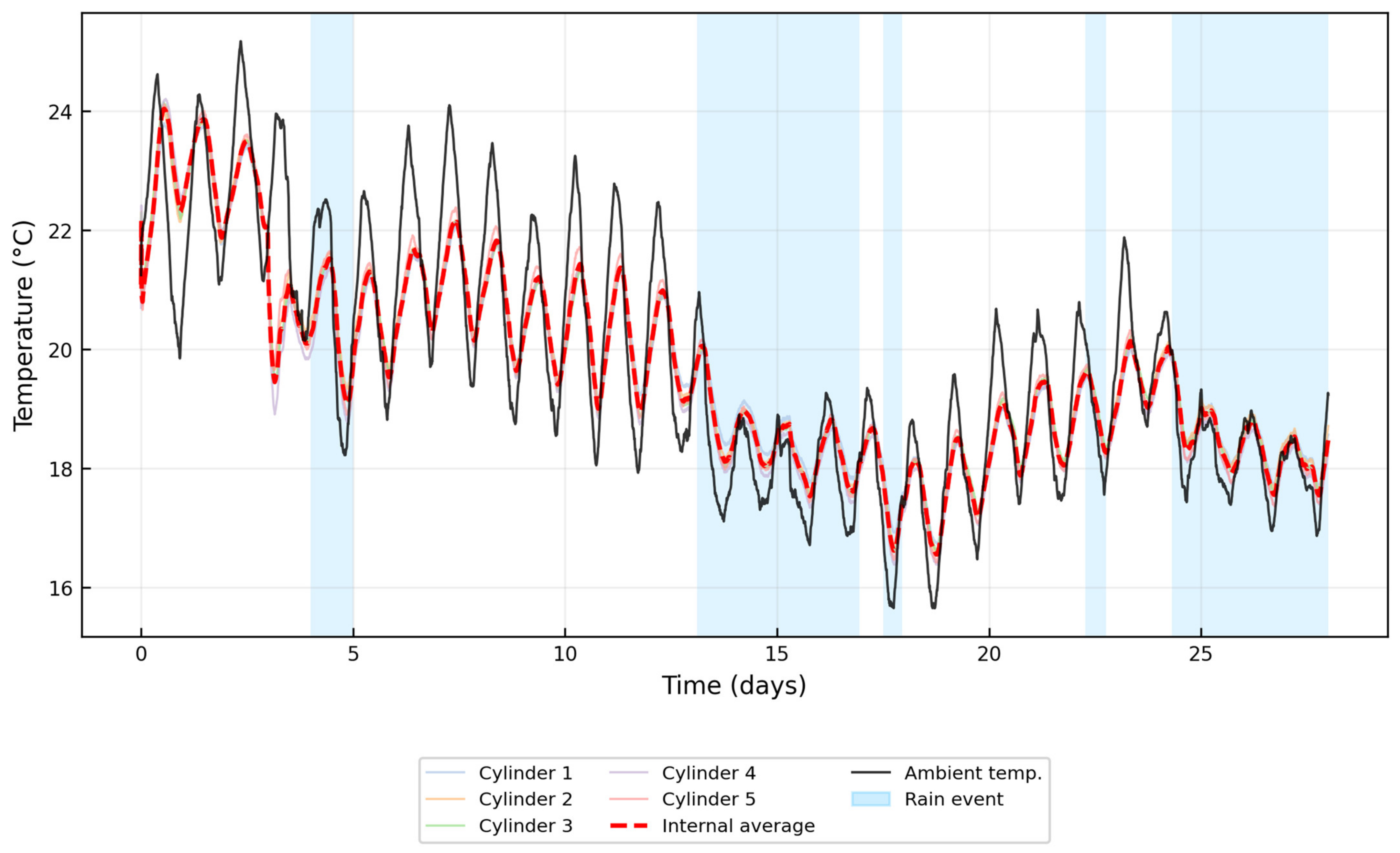 Figure 12 presents the ensemble-averaged internal temperature evolution over the 28-day monitoring period, compared with the laboratory ambient temperature.