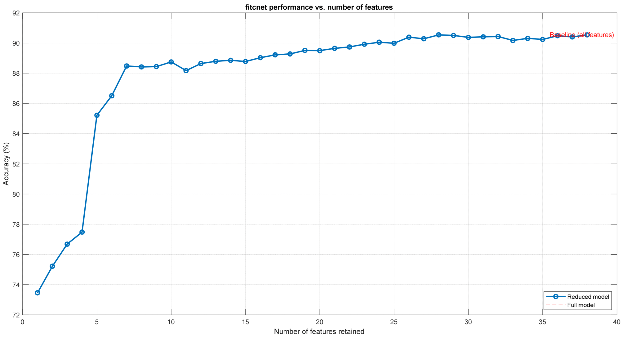 Recommended configurations: 7–10 features achieving 87–88% accuracy with 73–81% complexity reduction.