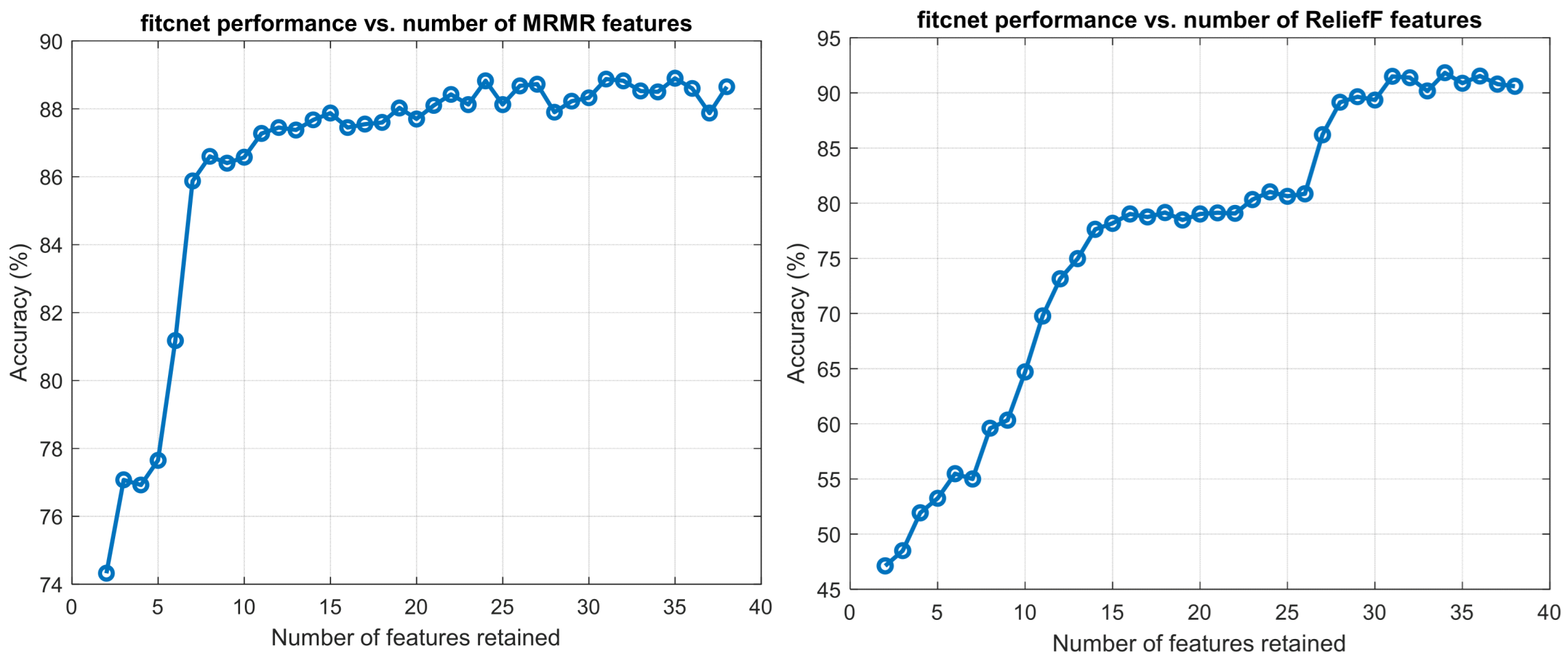 Figure 10. This performance is remarkably close to MRMR’s optimal result (88.90% with 35 features), achieved with slightly fewer features, demonstrating that the geometric local-neighborhood approach of ReliefF identifies a highly efficient feature subset through fundamentally different algorithmic principles compared to MRMR’s information-theoretic framework.