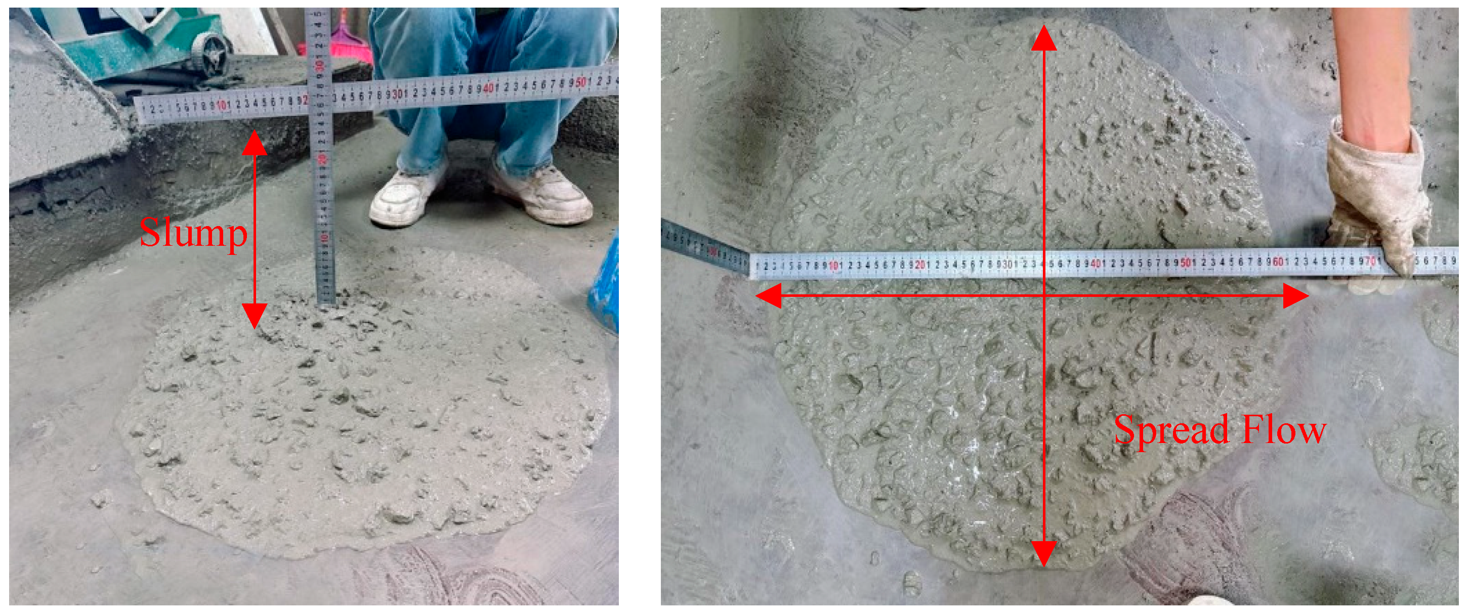 - Wu, J.; Yao, L.; Du, H.; Liang, J.; Rong, H.; Yan, Z.; Wang, L.; Liang, H. Study on Time-Dependent Variation of Rheological Properties of Machine-Made Sand Concrete. Concrete 2023, 135–140. Available online: https://kns.cnki.net/kcms2/article/abstract?v=L9QYEmxDei16Z1umxlPKyKtI2m1n7LRLB8PHBBl8hXJ5XiYUZUDhk_wSJ_rncLQPR_k15sh1XRCYz4D3HflQ86Xo0550sxH50O__RfYN2JXDDj26-SHuBB5wDOKW42fDUMgRIKhijqehXuD7RcO4efOOGLxUYlQ7M4gD2kpSMbVvOShDefIa-Q==&uniplatform=NZKPT&language=CHS (accessed on 1 November 2025).
