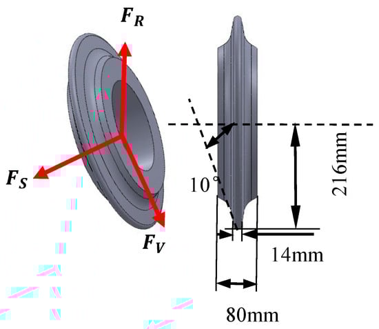 The hob model employed in this study is a 17-inch (diameter D = 432 mm) disc hob with a constant cross-section [17]. The constant cross-section model of the 17-inch hob was established using SolidWorks 2019. During the rock-fragmentation process, three-directional interaction forces act between the hob ring and rock, as illustrated in Figure 5. The vertical force (FV), directed normal to the rock surface, is generated by the thrust applied from the cutterhead; the rolling force (FR), tangential to the direction of hob movement, is produced by the torque from the cutterhead; and the side force (FS) acts radially toward the center of the cutterhead.