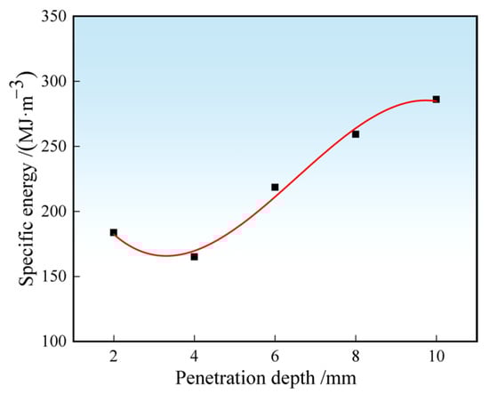 The specific energy of rock fragmentation under different penetration depths was calculated according to Equation (9), and the results are presented in Figure 12. This behavior can be attributed to the following mechanism: as the penetration depth gradually increases to the point where the rock ridge between adjacent hobs diminishes, the volume of rock fragmented by the hob increases, leading to a decreasing trend in the specific energy for rock fragmentation. However, when the penetration depth further increases, over-crushing of the rock occurs between the hobs. At this stage, the incremental growth in the volume of fragmented rock decreases, resulting in a higher energy consumption required to break per unit volume of rock. Consequently, the specific energy increases and the rock-breaking efficiency decreases. This observed rule is consistent with the rock-breaking behavior of hobs on flat cutterheads. When the cutter spacing is S = 40 mm, the specific energy reaches its minimum within the penetration depth range of P = 2–4 mm, indicating the highest rock-breaking efficiency under these conditions.