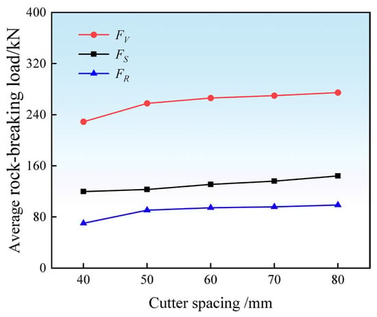 Under the condition of P = 10 mm and V = 9 r/min for both hobs, and considering the typical hob cutter spacing range of 30–100 mm, only the cutter spacing was varied in this experiment. Simulations were performed for five different cutter spacings within the range of 40–80 mm. Given that the cutter spacing primarily influences the rock-breaking load of the back hob, only the average load of the dual-hob system was analyzed. The average rock-breaking loads are presented in Figure 13. The results indicate that the average lateral force, vertical force, and rolling force all increase with larger cutter spacing, though the rate of increase gradually decelerates. This behavior can be attributed to the fact that the leading hob induces internal damage and micro-cracking in the rock, thereby reducing the load required for the trailing hob to fracture the rock. As the cutter spacing increases, the influence of the leading hob on the trailing hob diminishes, weakening the synergistic rock-breaking effect. With a further increase in spacing, the trailing hob effectively functions as a single cutter, and the average rock-breaking load stabilizes with minimal variation.