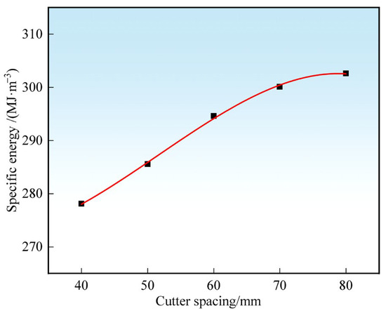 According to Equation (9), the specific energy of the hob breaking rock under different cutter spacing is calculated. The calculation result is shown in Figure 14, and the specific energy gradually increases with the increase in cutter spacing. With the increase in cutter spacing, the specific energy changes slightly. The reasons are analyzed as follows: when the cutter spacing continues to increase, the synergistic effect of adjacent hobs gradually weakens, making it difficult to form large rock blocks, while when the rolling force increases, the rock-breaking volume decreases, the rock-breaking specific energy continues to increase, and the rock-breaking efficiency decreases. When the cutter spacing continues to increase, both hobs are equivalent to single-cutter rock-breaking; the rock-breaking load and volume change little, and the rock-breaking specific energy is almost unchanged.