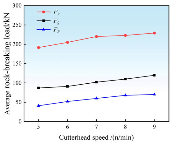 As the rotational speed of the cutterhead increases during the rock-breaking process, the interaction between the hob and the rock intensifies, requiring the hob to overcome greater reactive forces from the rock. Therefore, the selection of rotational speed is also crucial in studying the rock-breaking performance of the hob. To investigate the influence of cutterhead rotational speed on rock-breaking efficiency, a simulation analysis was conducted based on the established dual-hob rock-breaking model under various rotational speeds.