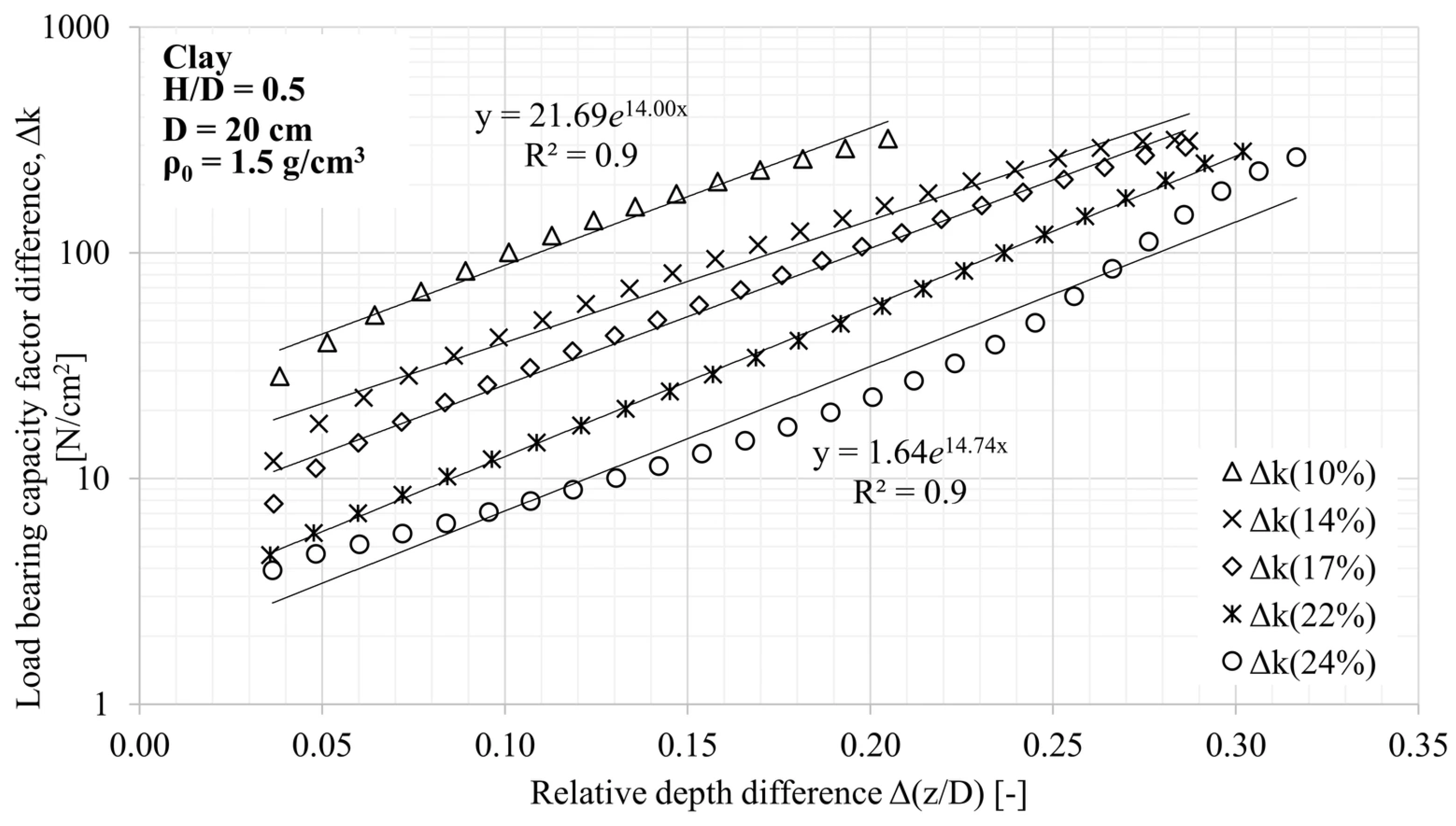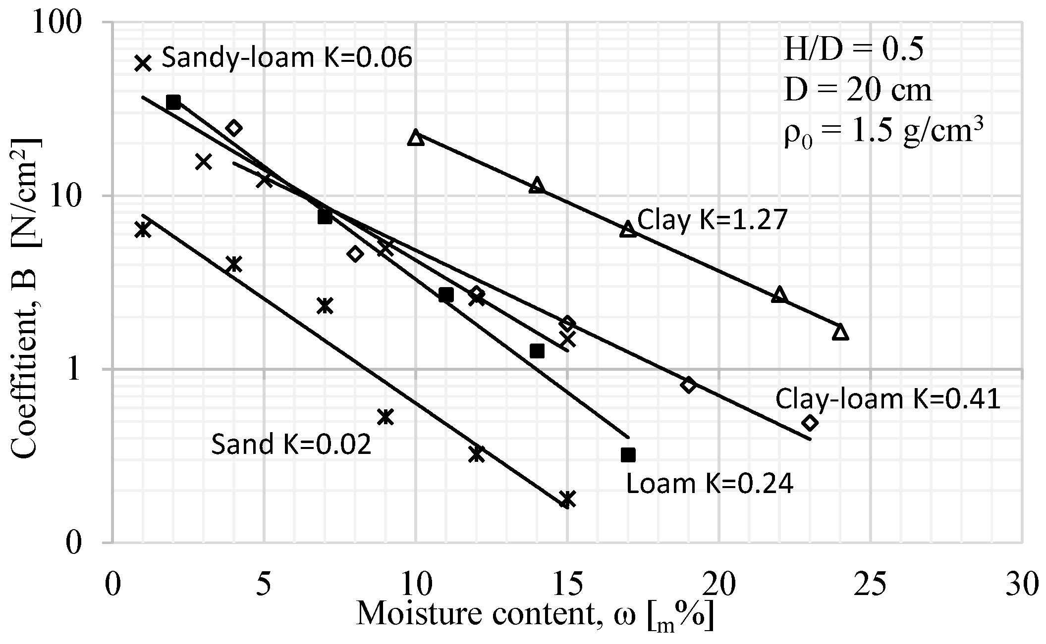 - The exponent (c) of the load-bearing capacity equation is independent of moisture content, thus confirming previous literature knowledge. However, the coefficient (B) is not independent of moisture content and is strongly related to it. Knowing the characteristic value of the clay content of the soil alone is not enough to further investigate the coefficient (B).