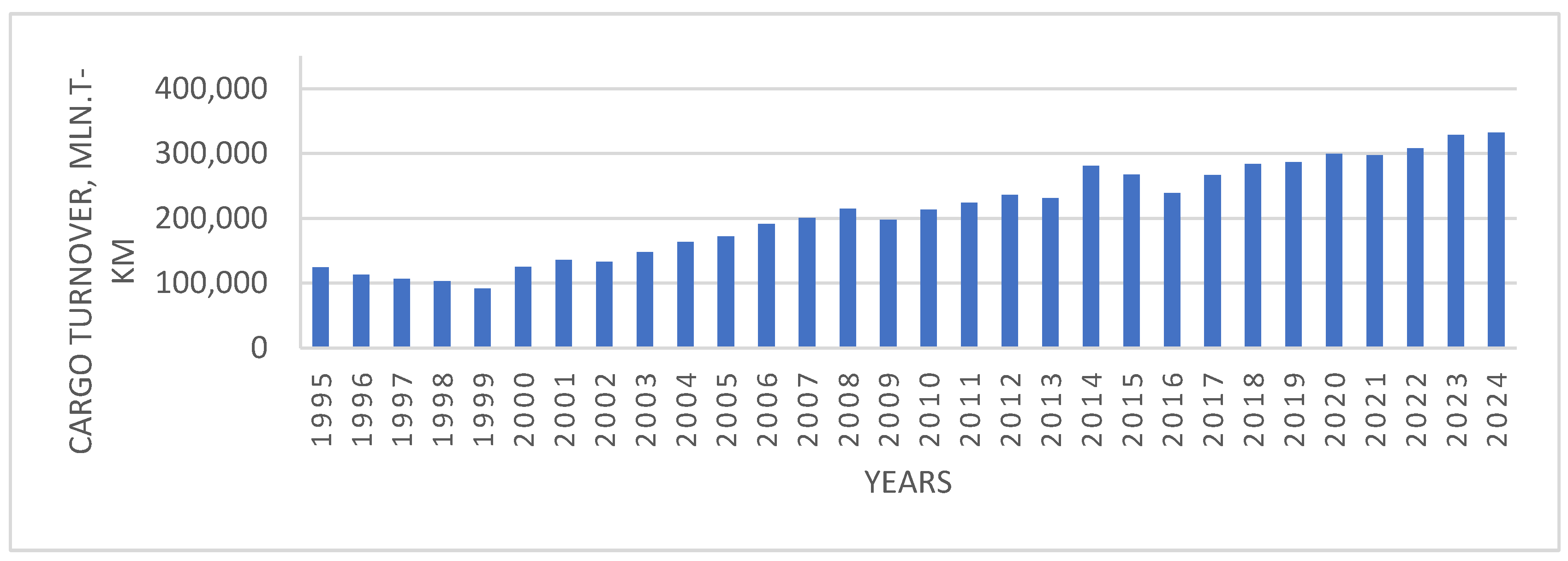 Figure 1). Within the framework of the international transportation, rail transport holds the leading position—about 60–65%—while motor transport accounts for 20–25%, and sea transport provides 5–10% and is used to reach the markets of the Middle East and Europe through the Mediterranean and Caspian ports [