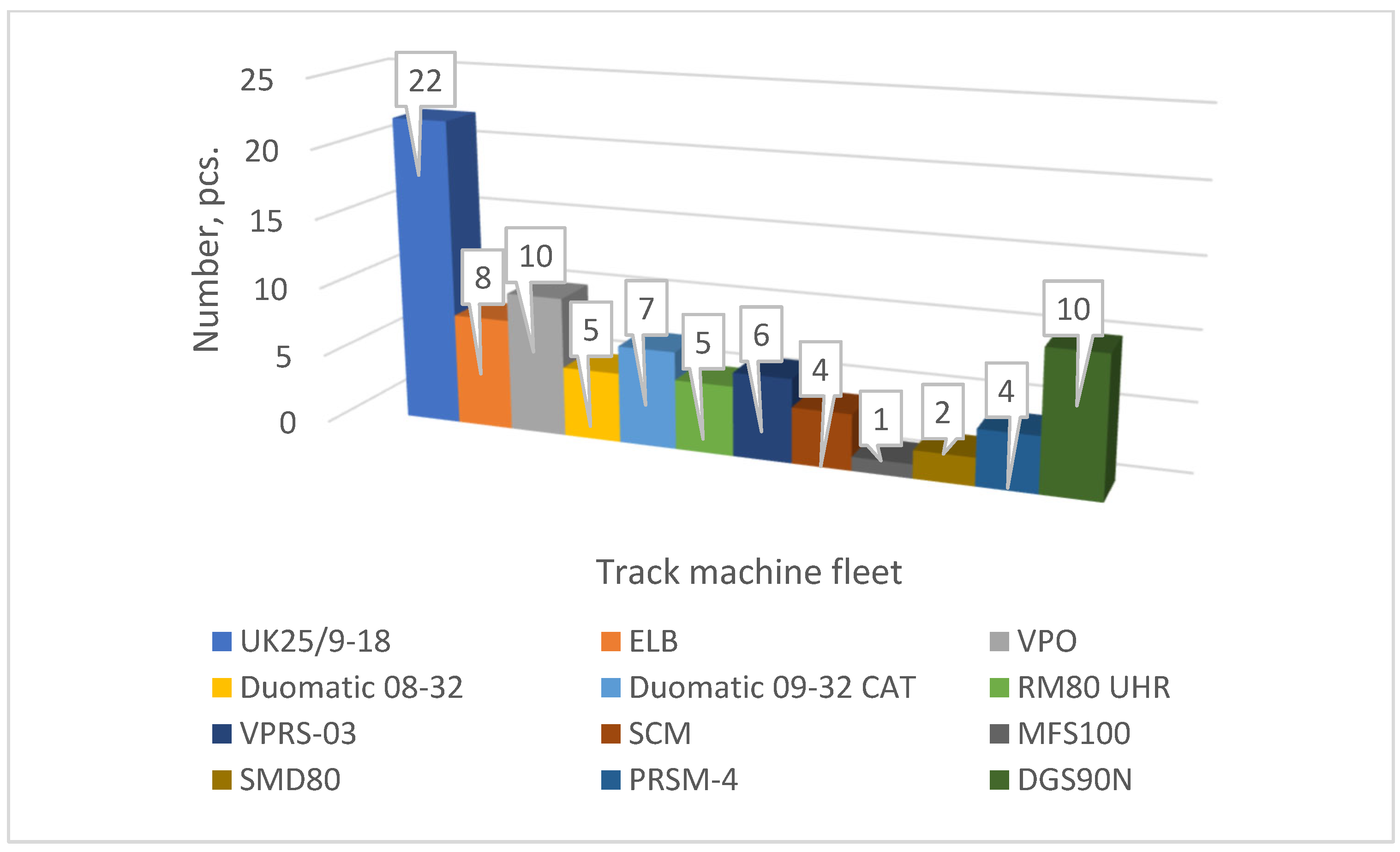 These machines are the main technical resources that ensure the maintenance of Kazakhstan’s infrastructure and the performance of scheduled and emergency repairs on the railway network. The structure and distribution of this track equipment fleet by the main types of machines are presented in