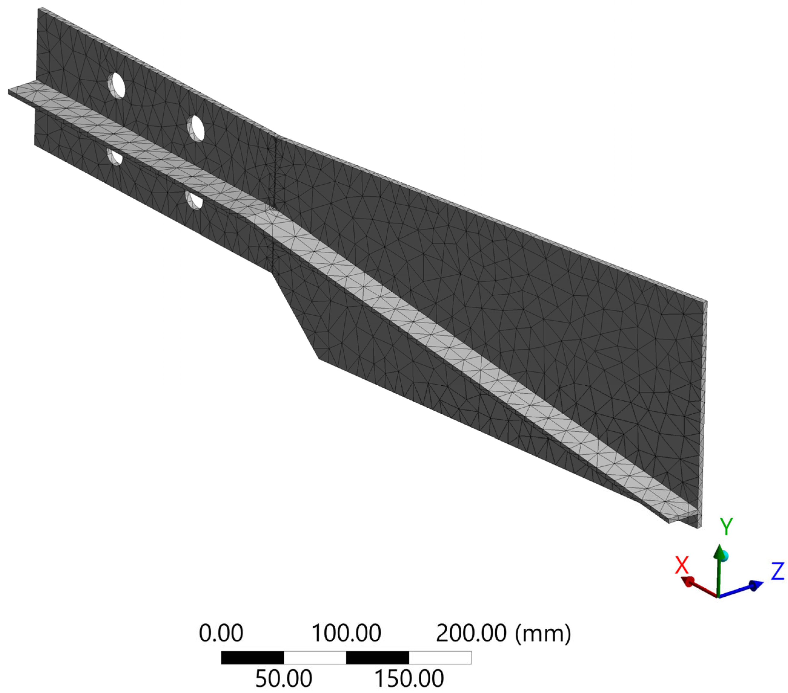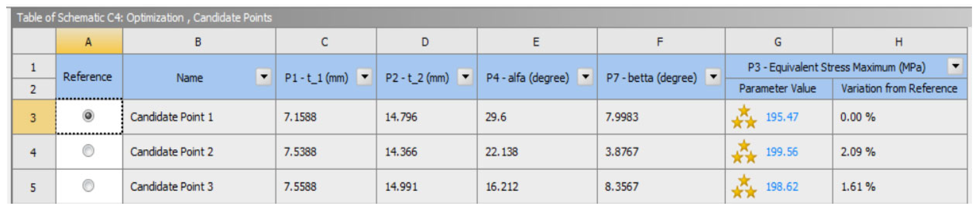 Candidate Point 1 is the basic variant, in which the element thickness t1 = 7.16 mm, t2 = 14.80 mm, and the angles α = 29.60 and β = 7.990. This variant showed the lowest Mises equivalent stress of 195.47 MPa.