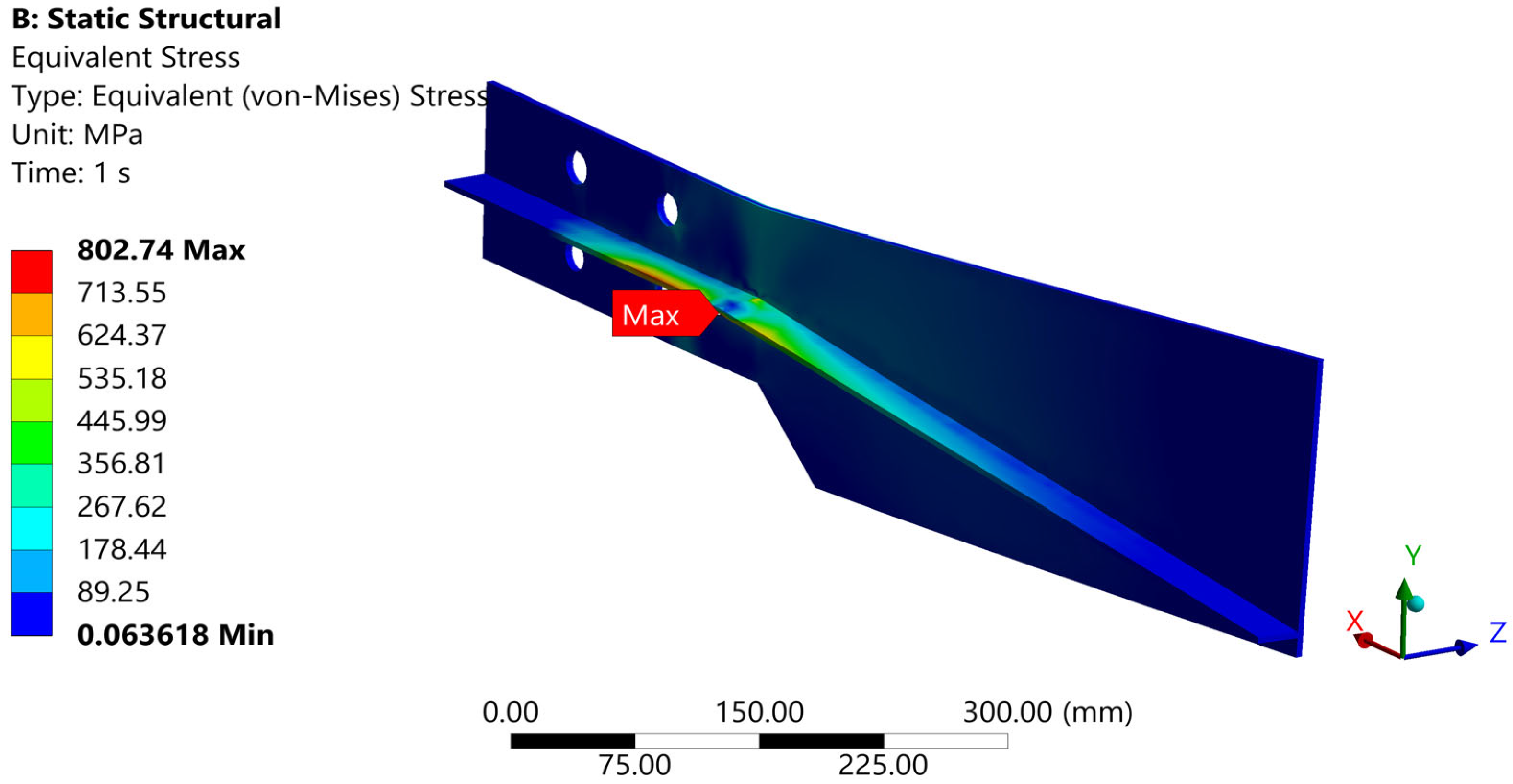 Thus, the lowest stress level is achieved with the Candidate Point 1 parameters, making this variant optimal in terms of strength. The changes in angles α and β are most critical to the equivalent stress level.