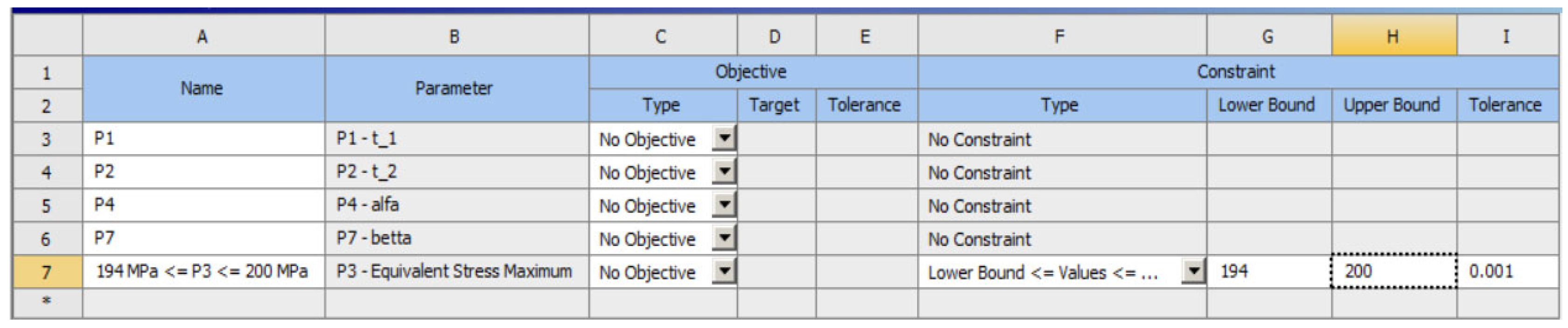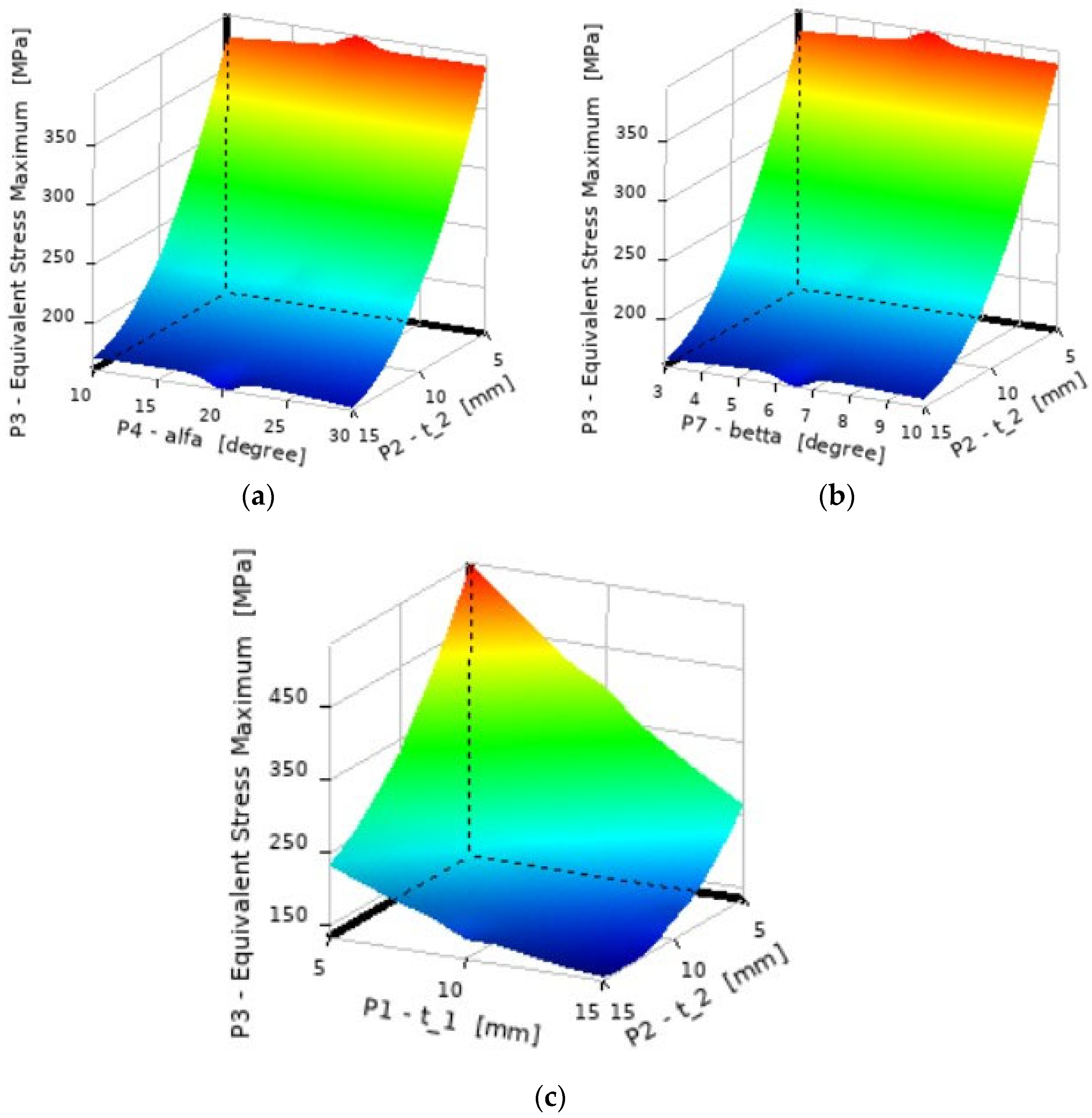 | No. | P1—t1 (mm) | P2—t2 (mm) | P4—α (deg) | P7—β (deg) | P3—Max Equivalent Stress (MPa) |