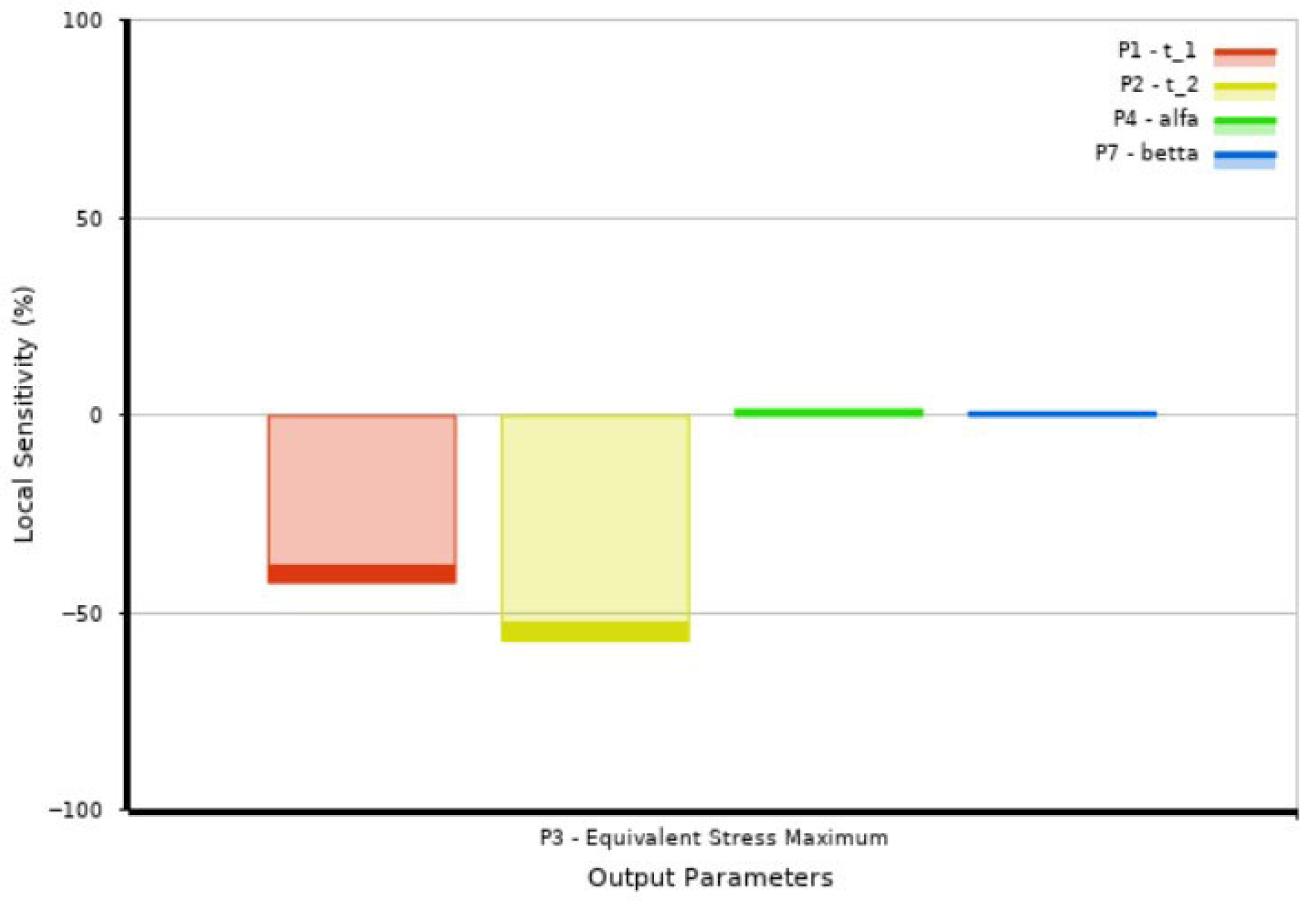 In order to quantify the influence of each design variable, a normalized sensitivity analysis was carried out based on the response surface model. The sensitivity coefficients were determined by evaluating the relative change in the output response (maximum equivalent stress) with respect to variations in each input parameter within the investigated design range. The variation range and corresponding stress response values are summarized in