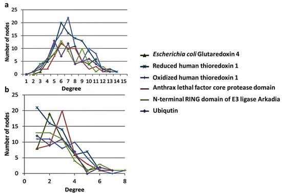 Degree distribution of (a) short- and (b) long-range interaction networks of six different proteins. Protein contact networks (PCNs) were constructed as described in the Materials and Methods section.
