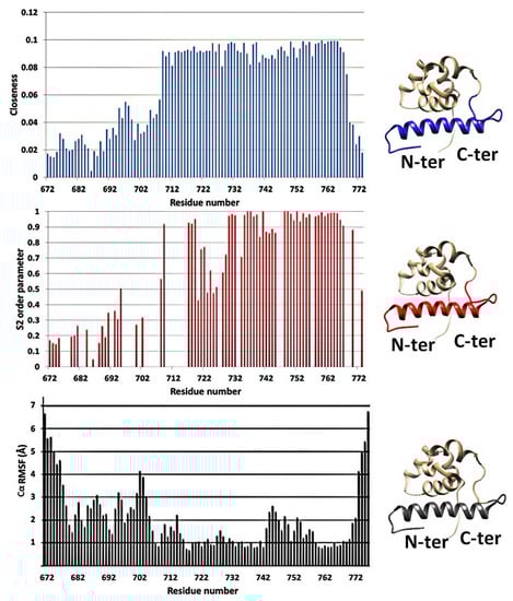 Network metrics for anthrax lethal factor core protease domain (PDB ID: 2L0R) [] were plotted against 15N NMR relaxation data (S2 order parameters for the N–H backbone vector) and RMSF (root mean square fluctuation) parameters from MD simulations (Figure 2) [,,]. Closeness centrality measures of N-terminal RING domain of E3 Ub ligase Arkadia (PDB ID: 2KIZ) were compared with 15N NMR relaxation data and RMSF parameters (Figure 3) [,,,]. These two proteins have completely different biological function and structure. In both cases, lower closeness centrality measures were correlated to increased mobility (elevated RMSF values or reduced S2 parameters) of a protein segment and vice versa. Differences between NMR relaxation experiments and MDs and PCNs analysis were detected only for the loop (G722-Y728) between helix α5 and α6 of the anthrax lethal factor core protease domain. This loop consists of residues with reduced number of long-range NOE connectivities [] and is probably the reason why the NMR relaxation studies indicate higher flexibility for this region. Thus, results from different protein structures taking into consideration NMR and MD data suggested that elevated closeness centrality measures correlated to lower mobility of amino acids within a protein segment.
