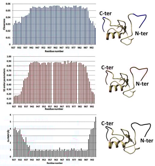 Closeness centrality, S2 values, and RMSF parameters from MD calculations for the amino acid residues of the RING domain of E3 ligase Arkadia (PDB ID:2KIZ) []. The colored regions in the 3D structures in the right panel indicate the flexible segments identified by the corresponding technique.
