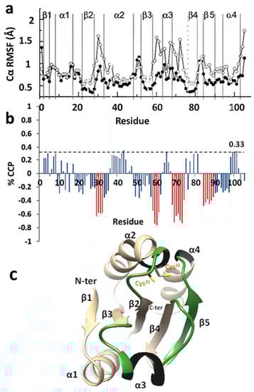 Percentage CCP values between reduced (PDB ID: 1ERT) and oxidized (PDB ID: 1ERU) human thioredoxin-1 (hTrx1) were calculated and related to changes in the corresponding RMSF parameters from MD simulations []. MD simulations (for 10 ns) for the oxidized and reduced hTrx1 (Figure 4a) showed that the reduced molecule had increased Cα RMSFs (increased flexibility) for the loops between β2 and α2 (L3), between β3 and α3 (L5), and between α3 and β4 (L6). L3 contains the active site cysteines (Cys32-Gly-Pro-Cys35), and thus reduction of the disulfide conferred increased flexibility to the region. Network-based comparison of the reduced versus oxidized hTrx1 revealed that the % CCPs of parts without any fluctuation changes (β1, α1, β2, as revealed by MD simulations) were in the order of ±0.3. The % CCP value of ±0.33 was therefore set as the relative threshold-noise value that included all non-significant % CCP changes. Under this consideration, significant negative % CCP values were observed for the three loops with increased flexibility (L3, 5, and 6; Figure 4b), explained by the lower plasticity of oxidized hTrx1 compared to the more flexible reduced form. The segments with negative % CCPs (with values more than threefold above the threshold (±0.33) corresponded to 0.5–0.7 Å increases in the RMSF values (MD simulations).