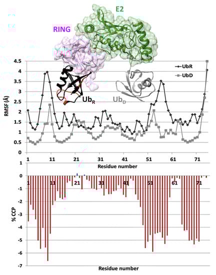 Cα RMS fluctuations of UbR (black symbol) and UbD (grey symbol) [] and % CCP values between UbR and UbD of the UbR–RING–E2–UbD complex (PDB ID: 5D0K). The areas of UbR with increased flexibility as detected by % CCP values are shown in red.