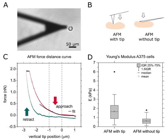 (A) Micrograph of a cantilever without tip approaching an adherent A375 cell. (B) Principle AFM with and without tip. (C) Force–distance curve of an exemplary measurement with cantilever stiffness k = 0.03 N/m, force set point f = 2 nN, approaching speed v = 1 µm/s and approaching distance d = 5 µm. The pause between approach and retract is 1 s at constant force. (D) Comparison of AFM force spectroscopy results of the Young’s modulus of A375 cells using a cantilever with tip and one without tip. The boxplot summarizes the results on about 50 cells with approximately ten force curves per cell of AFM measurements with and without tip. The cantilever without tip is 20 μm wide at the front, and the tip radius of the approximately 3 μm long tips used here is 20 nm.