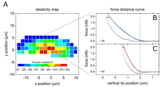 For the “AFM with tip” measurements, a pyramid-shaped tip of the type MLCT-BIO (Bruker company, MA, USA) [24] with an edge length of about 3 μm, tip radius 20 nm, an angle of α = 35° and a cantilever stiffness of 30 mN/m is used. “AFM without tip” implies that 20 μm wide cantilevers without a tip are being used (MLCT-010-D, Bruker Company, Billerica, MA, USA). To adjust the model underlying the fit function, we approximate the geometry by a spherical shape with the radius R = 10 μm. Statistics on the cantilever spring constants are summarized in Table S1.