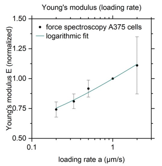 Young’ modulus E as a function of the loading rate normalized to the Young’s modulus from reference measurements with a loading rate a = 1.0 µm/s. The logarithmic fit function is E = 0.98 + 0.19 ln (a + 0.1).