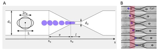 The microchannel consists of a polydimethylsiloxane (PDMS) single layer fabricated by standard soft lithography [25], which was bonded onto a glass slide by plasma activation. Generally, all channels were 7 mm long, 27 μm deep and 50 μm wide. The central part of interest is comprised of a single stenosis, in which the channel width was reduced from 50 μm to 5 μm or 7 μm. The elongation length, i.e., the length over which the channel width is reduced from 50 µm to the stenosis, is either 55 µm or 165 µm. The setup consisted of the microchannel, a pipette tip serving as the cell suspension reservoir and a syringe pump (Harvard PHD2000, Harvard Apparatus, Holliston, MA, USA). A Hamilton Gastight Syringe (Hamilton Bonaduz AG, Bonaduz, Switzerland) containing phosphate buffered saline (PBS, pH = 7.4) was connected to the microchannel via a polyfluoroethylene (PTFE) tube. The pump was operated in reverse mode to provide a controlled flow by drawing the suspension from the reservoir through the microfluidic channel at a flow rate of Q = 75 µL/h. We observed the cells using the 20× objective of an inverted microscope (Zeiss Axiovert200) equipped with a high-speed video camera (FASTCAM Mini UX50 type 160K-M-16G, Photron GmbH, Reutlingen, Germany). The videos were recorded with the software Photron Fastcam Viewer PFV from Photron at 2000 frames per second, 1280 × 120 pixel resolution, 1/40,000 s exposure resulting in a maximum total of 74 531 frames or 37 s in real time, covering an area of 704 × 66 μm². For analysis, we adapted our customized software SURF, introduced earlier [26,27].