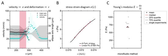 In summary, the stress acting on the cells in a stenosis is calculated from the velocity (Figure 5A), the cell size, and the resulting drag and shear force, which finally allows to plot the stress as a function of the strain. For a linear elastic material, the Young’s modulus is given by the slope of a stress–strain diagram. Analyzing the strain from our data, as being shown in Figure 5A, and calculating the stress from the data shown, together with some additional information, such as geometry, we obtain a stress–strain diagram, as shown in Figure 5B. It summarizes all ~2500 cell trajectories of one measurement. Figure 5C, finally, displays the resulting Young’s moduli for six independent measurements ranging from E = 300 Pa to E= 1000 Pa.