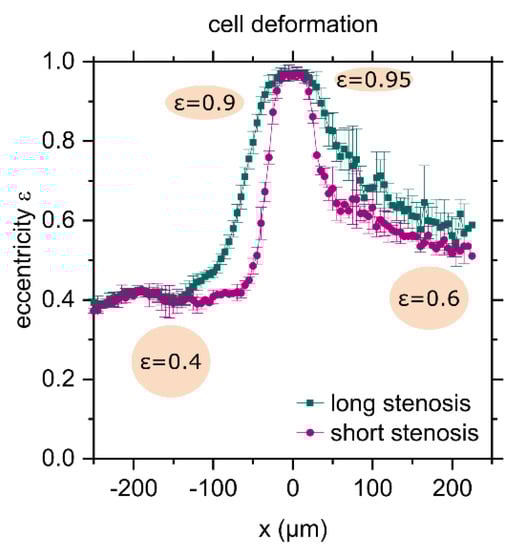 The plotted eccentricity is the ratio of the distance between the foci of the ellipse and its major axis length. The value ranges between 0 and 1, where the degenerate cases are 0, a circle and 1, a line. Prior to passing the stenosis, the cells are already slightly elongated with . When passing the stenosis, the cell is deformed and lengthened, and the eccentricity rises to almost one, because the stenosis is much narrower than the cell’s diameter. After passing the stenosis, the cells partially relax and remain elongated with when leaving the camera’s field of view. Comparing the ellipses as depicted in Figure 6 for and , it should be noted that the difference is measurably large, but not particularly significant. Following the flow field, the cells deform and recover faster in a shorter stenosis with length e = 55 µm than passing a longer stenosis with length e = 165 µm. A more abrupt deformation hence seems to allow for better recovery. Whether the cells will return to their original shape after a longer period of time cannot be concluded from our data. However, as we occasionally witnessed cell rupture or budding, when a large cell reached the widening part of the stenosis, a limitation of this method as a non-destructive one becomes obvious. However, as our aim is to implement a method to measure E for moderate deformations, we did not further evaluate extreme flow rates or extremely thin constrictions. Moreover, more extreme flow rates would require another setup, where we suggest using glass channels. If the cells are particularly sensitive or if the focus lies on the cell’s viability after the measurement, those permanent damages have to be taken into account and the design of the stenosis may need to be adapted, for instance by widening the narrowest part. In general, however, the advantages outweigh the limitations, as a large number of cells can be analyzed in one measurement, the analysis is automatic and the measured quantity does not describe selective points, but actually the bulk elasticity of an entire cell.