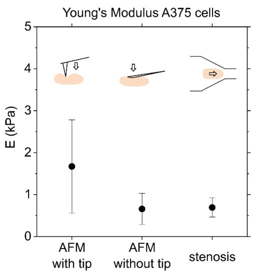 Comparison of AFM and microfluidic deformation analysis of the Young’s modulus of A375 cells. AFM: The result of AFM measurements with and without tip is the mean and standard deviation from measurements on 5–15 cells with 10 force curves per cell. Stenosis: Elasticity was also determined based on deformation under flow during the passage of a stenosis. The value here summarizes the six values from Figure 5, each of which relies on trajectories from approximately 2500 cells.