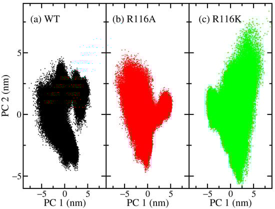 Projection of the MD trajectories for the WT, R116A, and R116K onto the two first principal components: (a) WT, (b) R116A, and (c) R116K variants. WT and R116A sample a configurational space of similar size and R116K explores a broader space.