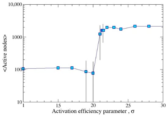 A colony is formed only when an appropriate combination of the initial density of seeds, f0, and the activity efficiency rate, σ, occurs. To exemplify this concept, in Figure 1 the mean value of active nodes vs. σ is reported. The analyzed range of σ is 10–30 and the most noisy data come from the range 19–22, showing a rather sharp transition. In other terms, while at the ends of the σ range each realization produces migration/colony with probability close to 1, in the intermediate region, the same value of σ may result in both migration or colony formation.