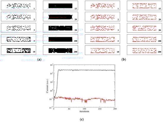 Colony formation in a rectangular lattice. The initial percentage of seeds is 5% of the maximal space occupancy. In the transition region (here σ = 21.5), the system can exit into a simple migration (a) or a colony formation (b). Each screenshot of (a,b) is obtained at a different iteration time, from 1 to 200. (a) Screenshots of the migration evolution of an initial seed distribution. In the first three screenshots seeds (black pixels) simply migrate. (b) Colony formation with same conditions as in Figure 1a. (c) Monitoring of the QS signal. The electrical current of the network mirrors the QS for the development of a colony (black), and a migration (red).