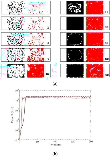 Colony formation in a 50 × 50 square lattice. Two different kinds of evolution are sketched. In black color: a quite large initial number of seeds (5% of total amount) with a small rate of reproduction (σ = 22). In red color: a smaller initial number of seeds (1.5% of total amount) and a large rate of reproduction (σ = 100). (a) Screenshots of colony formation taken at different evolution times from 1 to 200. (b) QS signal. The electrical current of the network reflects the QS for the development of a colony. The faster reproduction rate in the setup with a higher value of σ (red) with respect to that with a lower value of σ (black) is well reproduced.