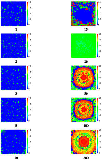 Colony formation in a square lattice. The color scale represents the Q values. The screenshots refer to a 50 × 50 network, initial amount of seeds, f0 = 0.05, activity growth rate, σ = 22. This picture corresponds to Figure 3a (black dots).