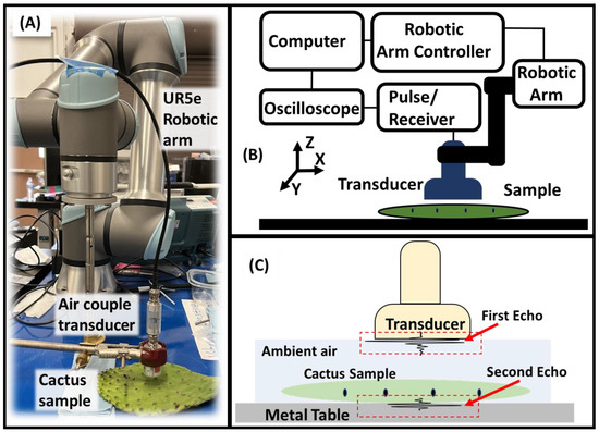 (A) The overall experiment setup: a UR-5 robotic arm was used to hold the air-coupled transducer and perform the scan. The scan area and scan path were controlled via MATLAB script. A prickly pear (nopal) pad bought from a MEXICO supermarket was used as specimen and placed in a lab environment at temperature = 20 °C and relative humidity around 4–50%; (B) schematic picture of all the components, including computer, robotic arm controller, robotic arm, oscilloscope, pulse/receiver, and an air-coupled transducer; (C) the elaboration of the measurement configuration. The volume of matter between the air-coupled transducer and the metal table was measured as a homogenized material. The variation in the cactus’s physical properties contributed to the effective value, as indicated by the effective medium approximation.
