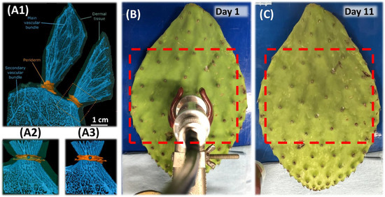 MRI scans of Opuntia ficus-indica (prickly pear) from reference [38]: (A1) overview scan includes vascular system (blue), dermal tissue (transparent green), and peridermal tissue (orange). The web-like structure of the vascular is clearly shown in the figure; (A2) surface coil scan with dermal tissue; (A3) surface coil scan without dermal tissue; (B,C) photographs of the scanned cactus sample at the start of the monitoring (day 1) and end of monitoring (day 11), with the red boxes indicating the EBME scanned areas on the sample.
