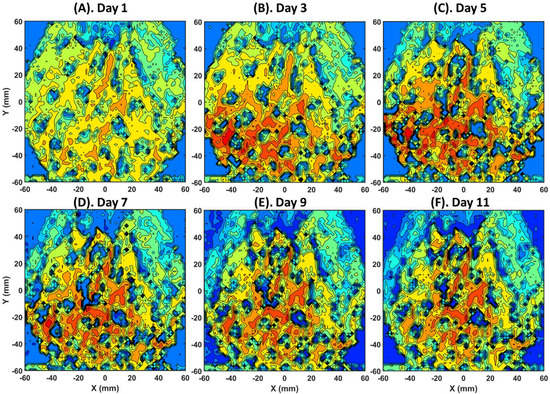 Figure 3 presents the entire ultrasound monitoring process with 2 days as time intervals. The outer boundaries of the cactus sample can be observed in all the elastographic images with four corners of the ambient air regions. Figure 3A shows the cactus sample on the 1st day, which had the highest uniformity in terms of the effective elastic modulus. The central region of the cactus showed higher effective elastic modulus values with the presence of the spreading patterns, indicating the higher volume fraction of vascular bundles and water compared with that of the dermal tissue. Close to the boundary regions (around X = 40 and −40 mm, Y = 40 mm), the lower effective elastic modulus regions were indicative of a higher fraction of the dermal tissue. Figure 3B illustrates the elastographic image of day 3. A significant effective elastic modulus increase was observed in the central vascular bundles’ region due to dehydration hardening. Since the elastic modulus of water was lower than those of the vascular bundles and the dermal tissue, the decrease in water fraction effectively increased the fraction of the biomass, which induced an increase in the effective elastic modulus. On the boundary region of the cactus sample, the degradation in the dermal tissue was not clearly observed at this time point. In Figure 3C, comparing day 5 with day 3, the central region of the cactus experienced an increase in the elastic modulus due to continuous dehydration. On the boundary, a clear effective elastic modulus decrease was notable on the cactus due to tissue degradation, which induced a softening effect. From day 7, the dehydration-induced hardening effect almost stopped, as shown in Figure 3D. Hence, further tissue degradation induced a softening effect that started to introduce a lower effective elastic modulus over the entire cactus sample, especially on the boundary regions of the cactus sample. This time-dependent dehydration behavior estimated from the elastographic images relatively agreed with the almost exponential behavior described in the existing literature [39]. Figure 3E,F present the results of further ultrasound monitoring of the cactus sample on days 9 and 11; as expected, the hardening effect was not observed. The softening effect caused by tissue degradation was still significant from day 7 (Figure 3D) to day 9 (Figure 3E) in both central and boundary regions. Comparing day 9 (Figure 3E) to day 1 (Figure 3F), the difference between the elastographic images became more indistinguishable, which indicated a decrease in the rate of tissue degradation.