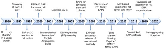 The field of supramolecular peptides self-assembly has undergone outstanding growth since the early 1990s when a self-assembling peptide (SAP) as a repeating segment in a yeast protein was serendipitously discovered by Shuguang Zhang [,]. From then on, the field expanded at an accelerating pace and these self-assembled materials have become an integral part of a broad plethora of designer nanomaterials [,,,] (Figure 1). In the decades that followed, others spread this concept to a wide range of peptides (different in natural and non-natural amino acid sequence, length, hydrophilic and hydrophobic residues, secondary and tertiary structures, forming nanostructures), thereby creating functional supramolecular materials useful for different applications including three-dimensional tissue cell cultures of primary cells and stem cells [], three-dimensional tissue printing [], sustained releases of small molecules, growth factors, monoclonal antibodies, and siRNA [,,], regenerative medicine, as well as tissue engineering [,,,,], stabilization of membrane proteins (i.e., G-protein coupled receptors, and photosystem I) for designing light harvesting nanobiodevices [,,], actuators for optics and fluidics [], antibiotics to combat drug resistance [,,,], vaccines against viruses [,,,].