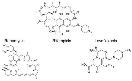 Structures of rapamycin, rifampicin and levofloxacin.