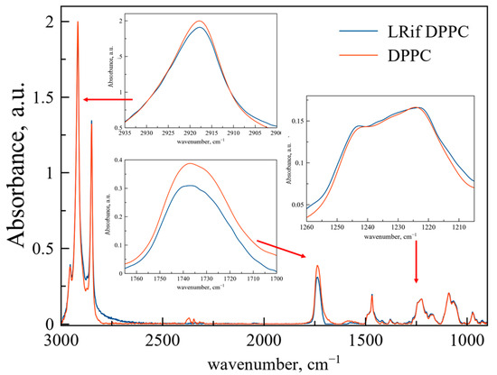 Figure 2 represents ATR-FTIR spectra of DPPC liposomes (red line) and DPPC-based LRif (blue line). In the insets, the main bands are scaled up for better representation and peak positions are presented in Table 2. According to the shape and positions of these bands, we propose no significant changes in the microenvironment of CH2 groups, indicating no penetration of Rif into bilayer depth. Only slight changes are detected for phosphate groups, indicating very small or even the absence of electrostatic interactions of polar head groups of lipids and Rif [28]. For ν(CO), we have detected the manifestation of a 1730 cm−1 shoulder, indicating small perturbation of this area of the bilayer in the presence of Rif [29] and the formation of a new population of medium-hydrated carbonyl groups. To sum up, interaction of Rif with the DPPC membrane is weak and does not lead to any significant changes in the bilayer at room temperature.