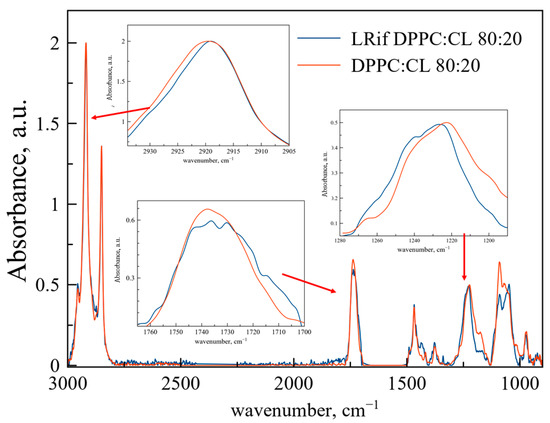 Normalized ATR-FTIR spectra of DPPC:CL 80:20 weight% liposomes and LRif. Total lipid concentration 5 mg/mL, 0.02 M sodium phosphate buffer solution pH 7.4, 22 °C. Rif spectra were subtracted as a background. Spectra of empty liposomes are red, spectra of LRif are blue. In the insets, areas of νas(CH2), ν(CO), νas(PO2−) are presented.